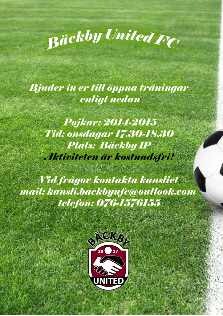 Bäckby United bjuder in till öppna träningar för både pojkar födda 2014-2015 och flickor födda 2013-2016. Båda grupperna tränar klockan 17.30-18.30 på onsdagar på Bäckby IP. Aktiviteten är kostnadsfri. Har ni några frågor kan ni kontakta kansliet via mail på kansli.backbyufc@outlook.com eller via telefon på 076-1576155.