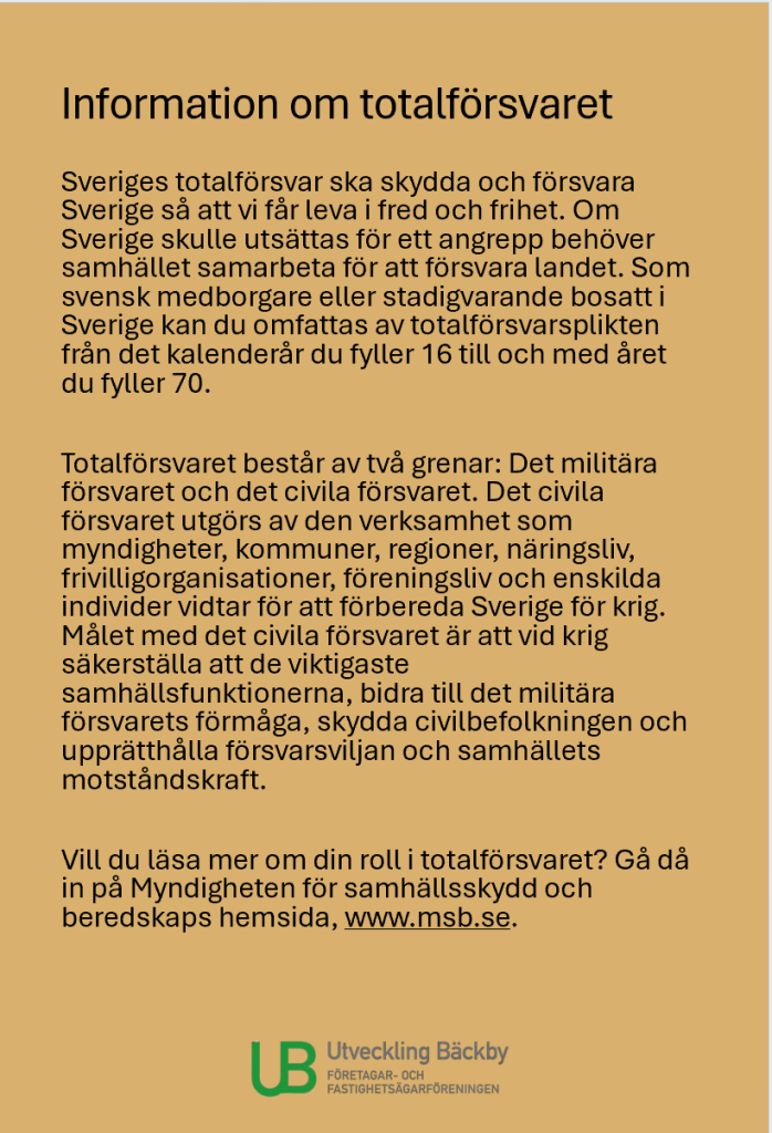 Som en del av Myndigheten för samhällskydd och beredskaps (MSB) nationella beredskapsvecka, vill företagar- och fastighetsägarföreningen Utveckling Bäckby sprida information om årets tema: Du är en del av Sveriges totalförsvar.