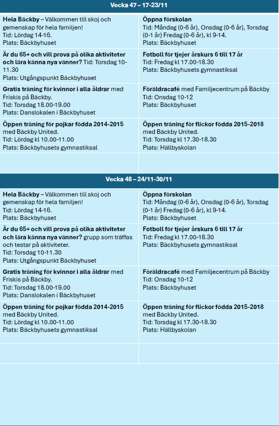 Här finner ni månadsbrevet för november. Månadsbrevet samlar några av de aktiviteter som finns tillgängliga på Bäckby.